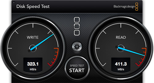 Using the Blackmagic Design Disk Speed Test, available in the Mac App Store, I measured the speed of the Fusion drive: 323.1 MB writing, and 411.3 reading. Whew! Truly fast!!