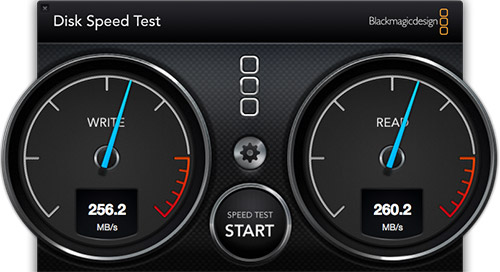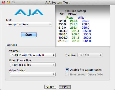 By way of comparison with other speed tests I’ve published, here is the speed of the G-RAID as measured by the AJA System Test utility, available from the AJA website, illustrating speed variations as the size of the file changes. Notice that the speeds average about 260 MB/second for both reads and writes.