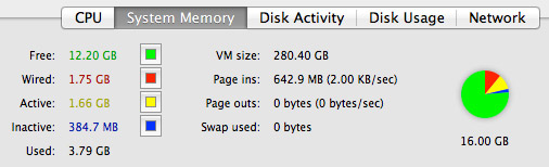 RAM usage, when running Final Cut Pro X editing a single stream of video, hovered around 2 GB. (The red pie slice indicates RAM used by the operating system. Yellow is RAM used by open applications. Blue is RAM assigned to an application, but not yet used. Green is unused RAM.)