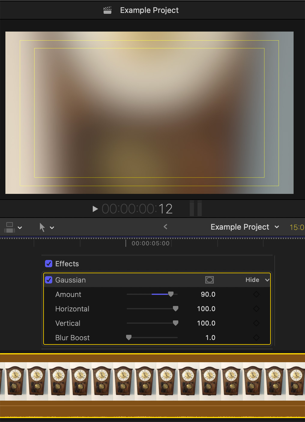 (This composite image shows the vertical clip in the Primary Storyline, along with the blur settings applied to it.)