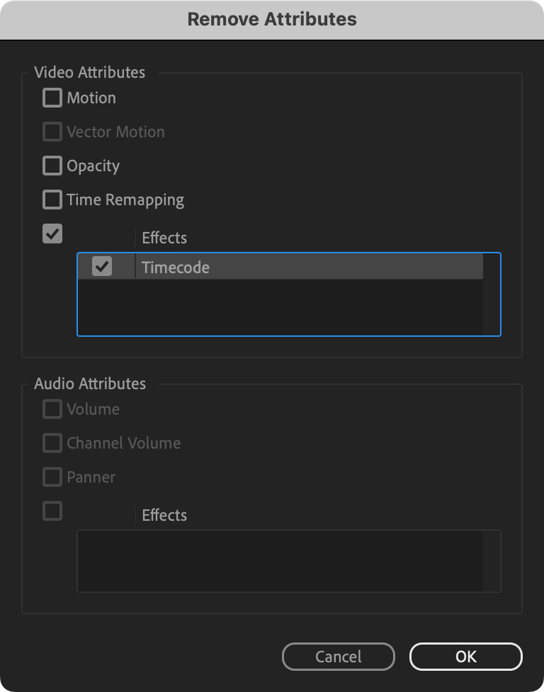 - In this panel, uncheck all options EXCEPT timecode. This will delete the timecode effect without changing anything else in the selected clips.
