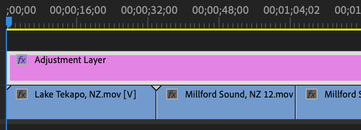 - Stretch the adjustment layer so it covers all clips for which you want to display timecode. Most of the time, that will be the entire sequence.