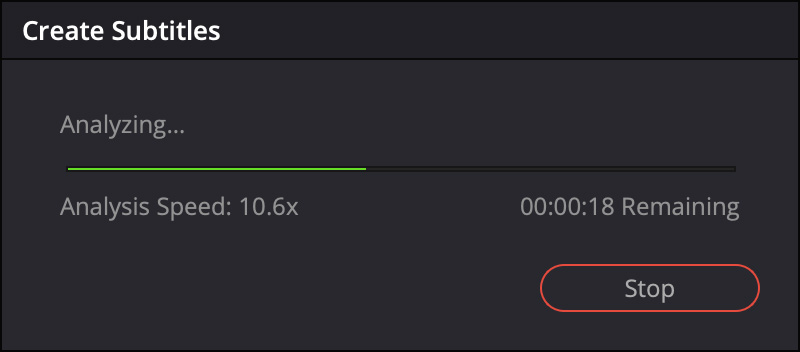 The software initializes the transcription language model, analyzes the clips, creates a text transcript, then, from that transcript, creates captions and places them on the timeline.