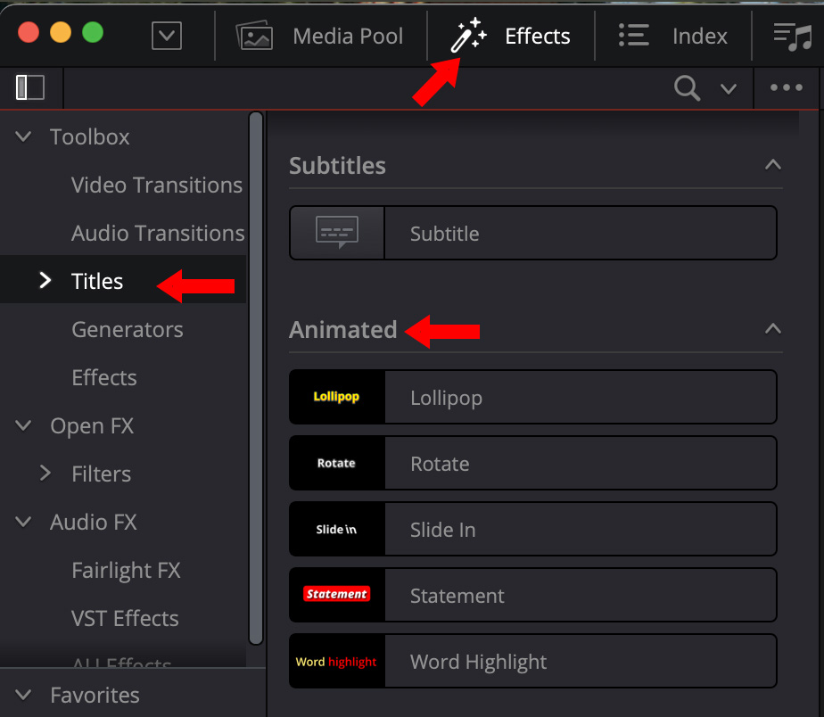 Click the Effects text button (top red arrow) at the top of the Resolve interface. Under Toolbox, choose Titles (middle red arrow), then scroll way down to Animated (lower red arrow).