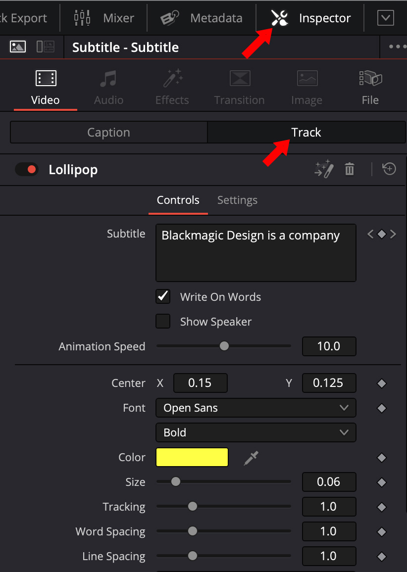 Select the Caption track in the Track Header, then open the Video Inspector (top red arrow) and click the Track text button at the top (lower red arrow). This gives you control over: