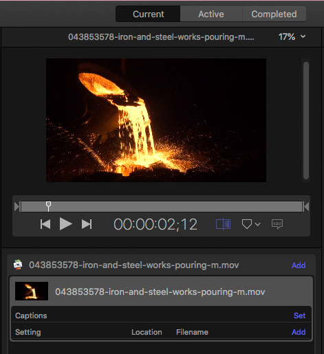 Choose File > Import Media (shortcut: Cmd + I ). Here, for example, is a clip of molten steel pouring into a form. I want to extract a short section where the steel just starts to flow.