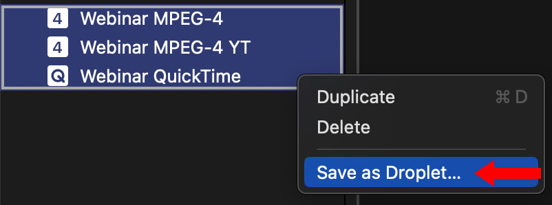 Right-click one or more compression settings – either Custom or Built-in and choose Save as Droplet.