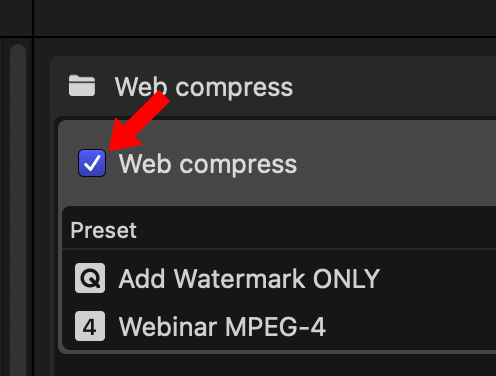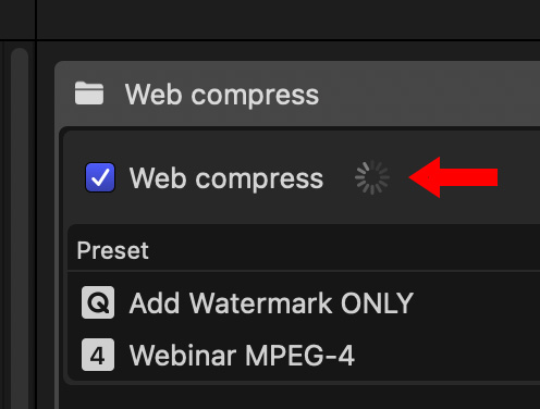 Minimize Compressor, but don’t quit it. Now, when you export a file into the Watch Folder, or drop one or more files into it, Compressor will automatically compress it. If the interface is open, active compression is indicated by the spinning gear (red arrow).