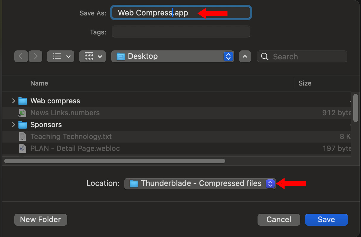 Give the droplet a name (top red arrow) and a location for the compressed file (bottom red arrow).
