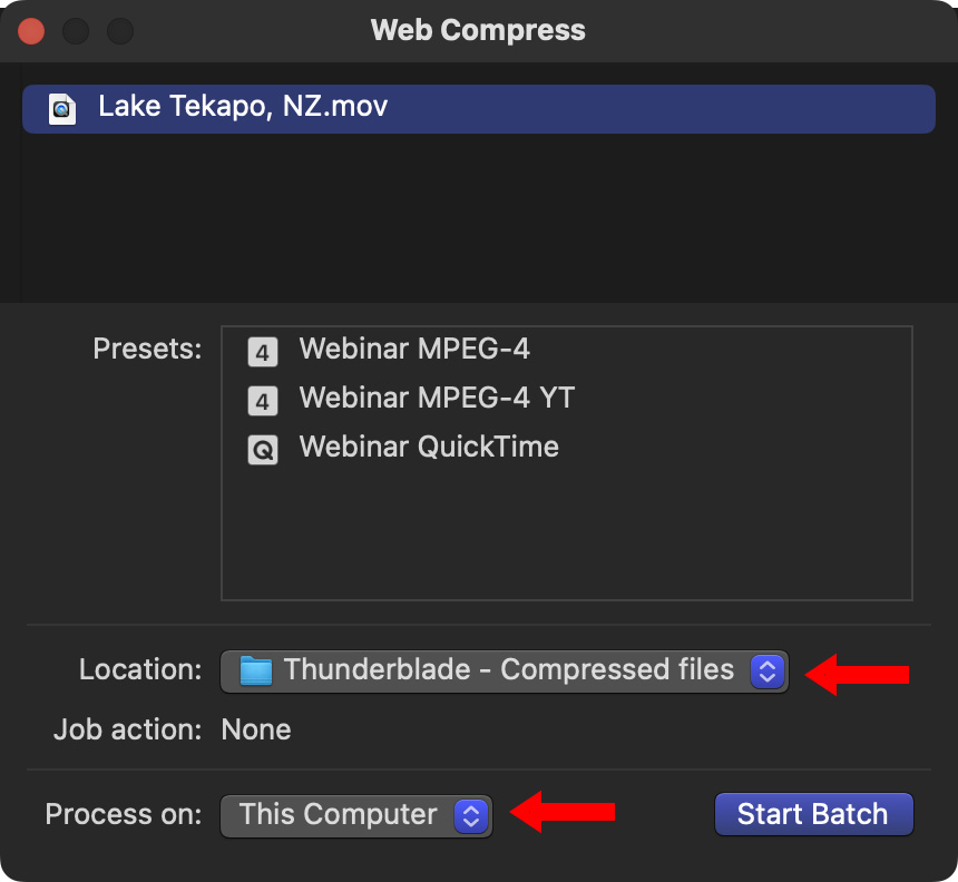 Normally, you drag the source file into the Compressor interface, apply one or more compression settings, specify the destination for the compressed file and click Start Batch.