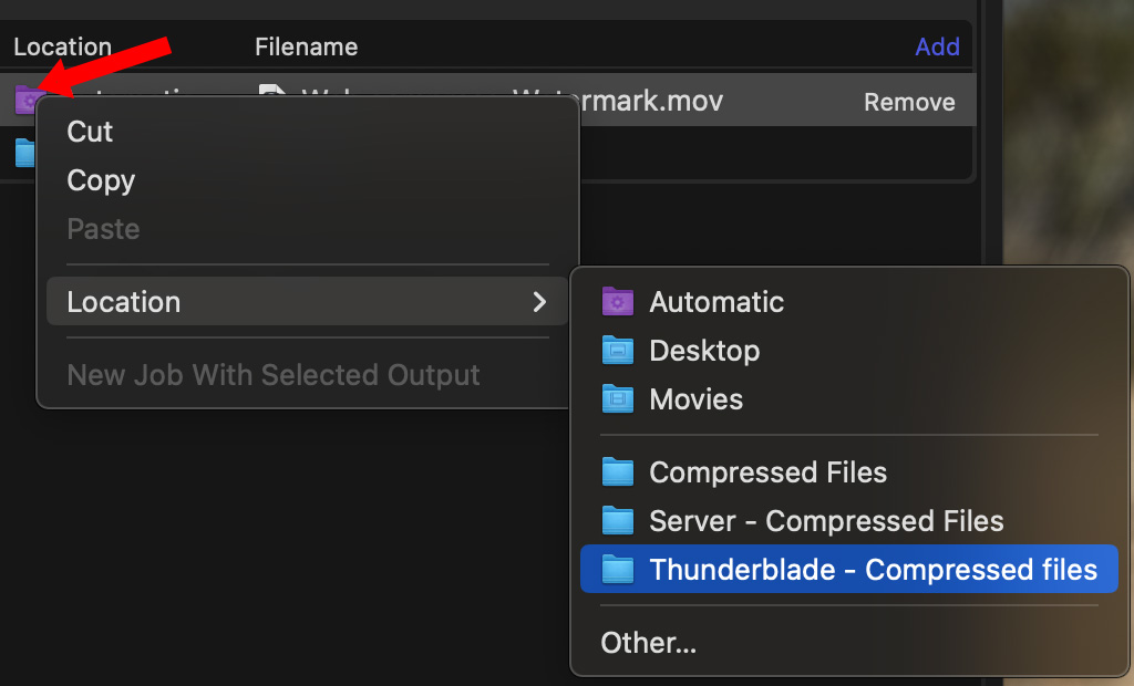 Right-click the Location to change where the compressed files will be stored (red arrow).