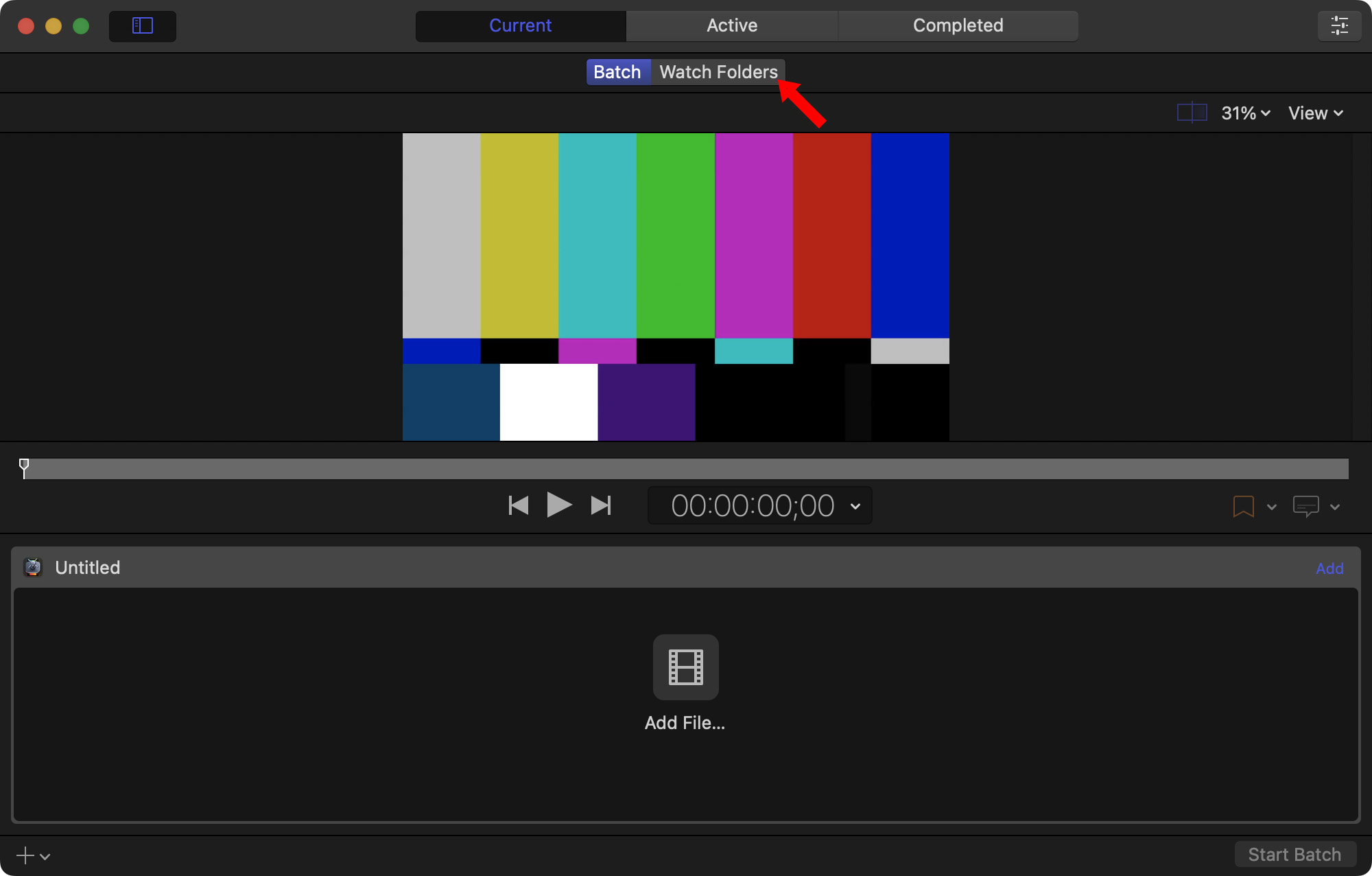 Open Compressor and click the Watch Folder (red arrow) tab at the top.