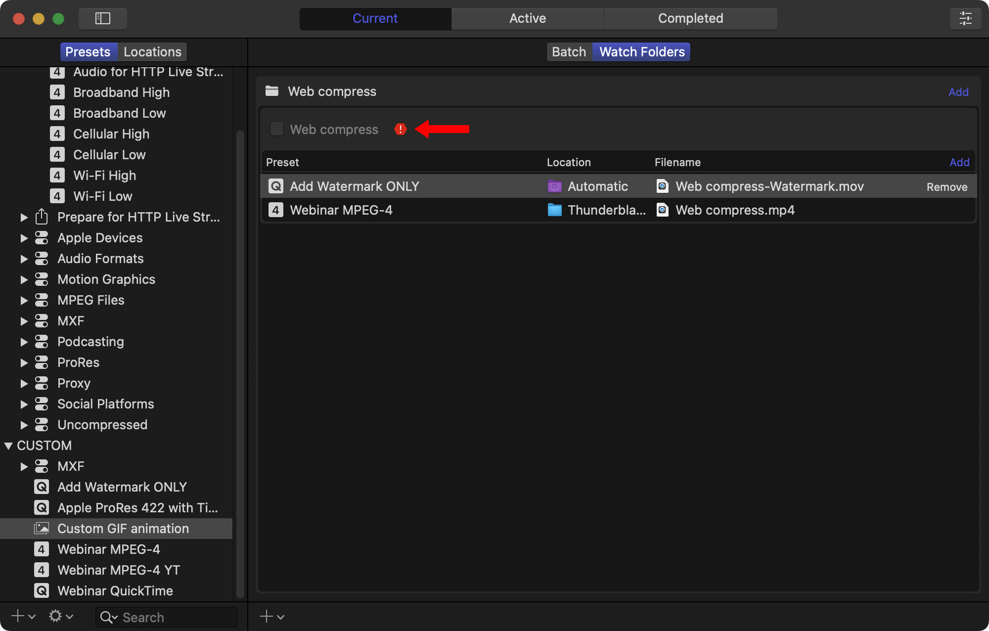 When all the settings are to your satisfaction, enable the Watch Folder by checking the folder name (red arrow).