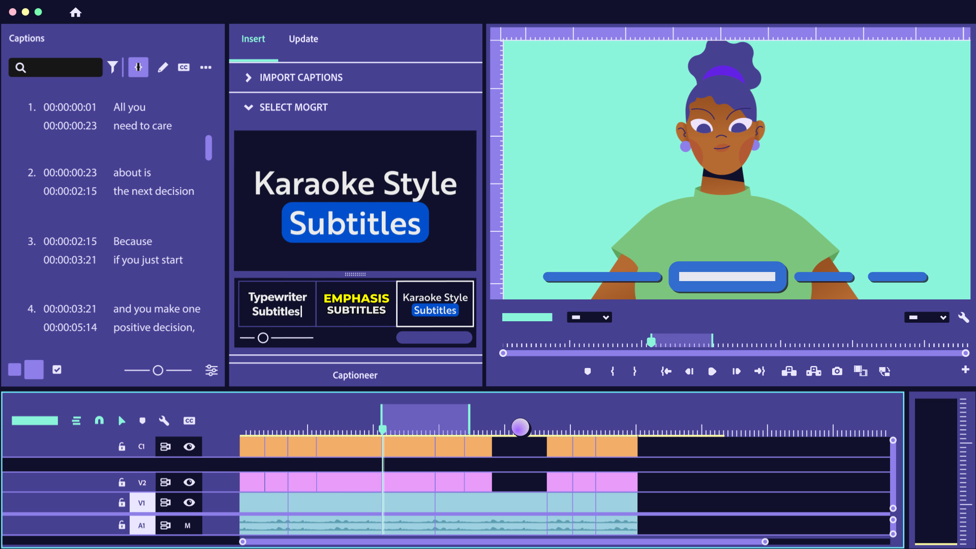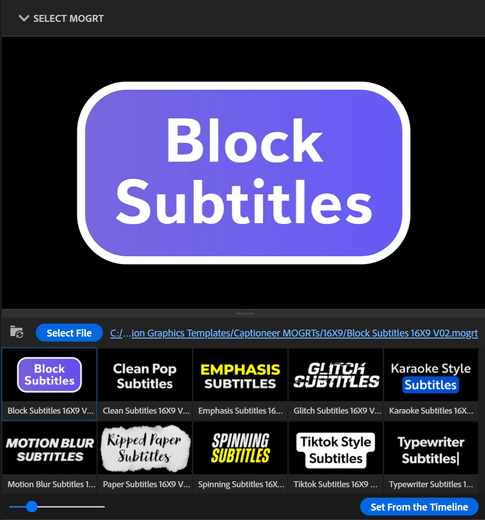 Nic: Captioneer is a Premiere Pro extension that creates animated captions directly in your timeline. It uses .mogrt files for the captions which are easily modified by an editor.