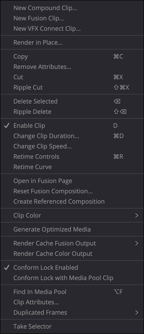 This screen shot shows what appears when you right-mouse-click on a flattened multicam clip in Resolve. “Decompose” and “Unflatten” are not options.