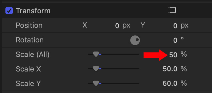 Before applying any effects, select and scale the timeline clip you want to soften to 50%, using Video Inspector > Transform > Scale (red arrow).