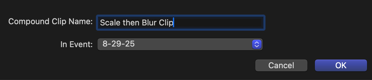 Because the clip is scaled in the compound clip before the blur is applied (i.e. Transform settings are calculated first), when you add the blur, the entire clip AND its edges are blurred. In other words, we changed the normal processing order of effects in the Video Inspector by forcing the scaling to be done before blurring.
