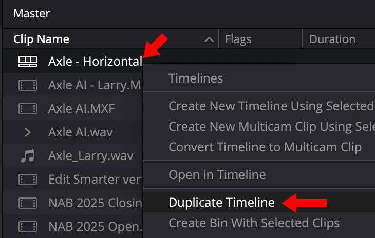 To change the aspect ratio, right-click the timeline name in the media pool and select Duplicate Timeline.