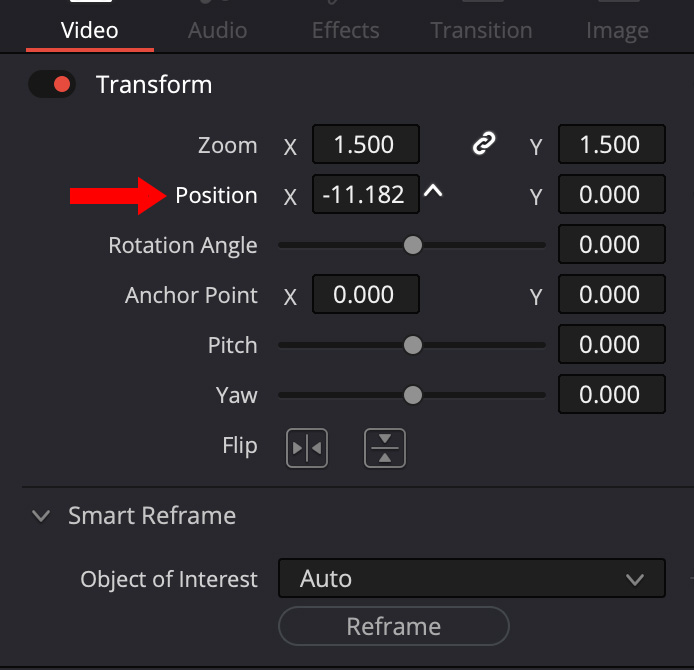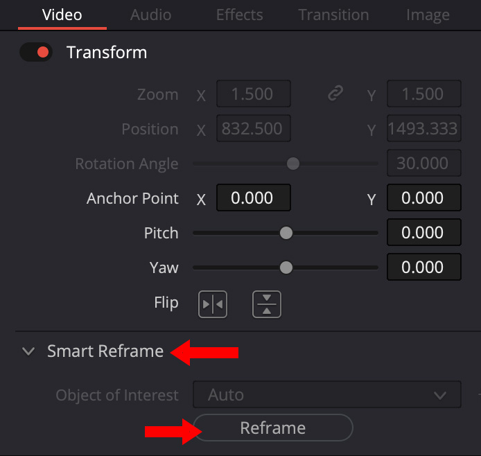 While changing the aspect ratio instantly creates a vertical format, most clips will need to be repositioned. While you can do this manually using the Position settings, there is a MUCH! better way: Smart Reframe. This is located immediately below Inspector > Video > Transform.