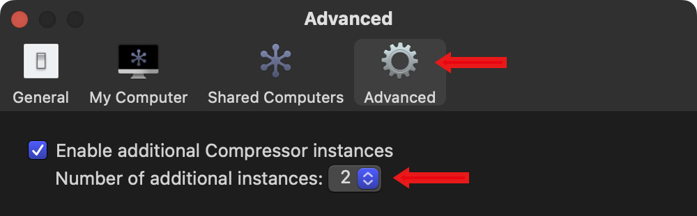 By default, Compressor does not use all the compression resources on your computer. So, to enable all the power your node system provides, go to Advanced (upper red arrow), check Enable additional Compressor instances and select the maximum number in the menu (lower red arrow).