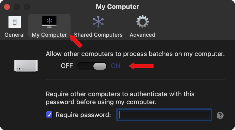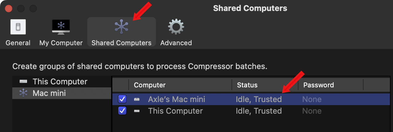 To enable sharing computer resources, start Compressor and go to Compressor > Settings > My Computer. As shown in the screen shot above, switch network compression On. Don’t enter a password, I found passwords are not always accepted by the host computer.