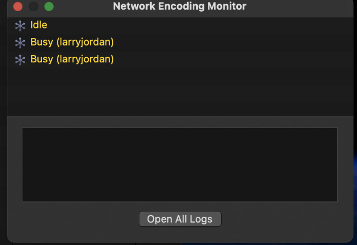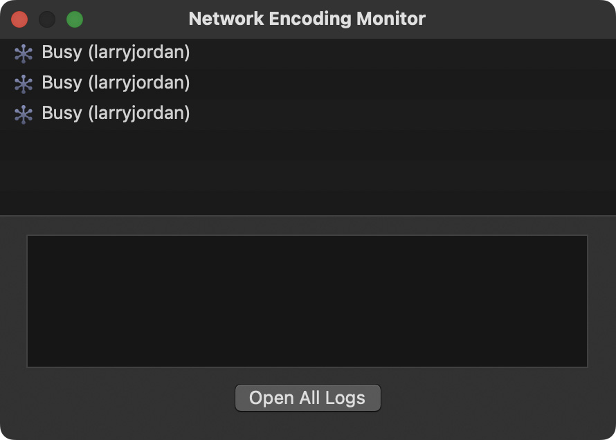 A really useful tool is the Network Encoding Monitor. It shows how many files – but not their names – are being compressed on that computer. Open this from Window > Network Encoding Monitor. This is what it looks like when compression is running on the host computer. Notice that the host is only compressing three of the six files.