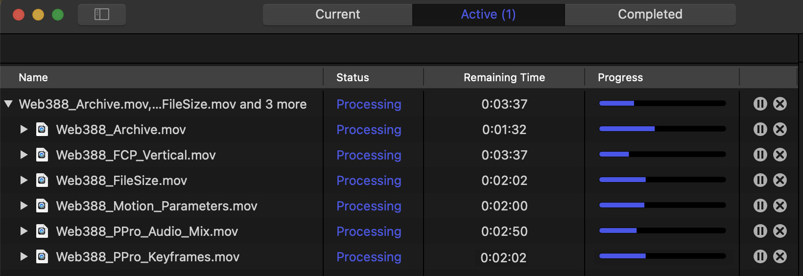 Instantly, Compressor switches to the Active panel and displays all active compression jobs. On a single computer, depending upon how many media engines it has, it will compress up to three files at the same time.