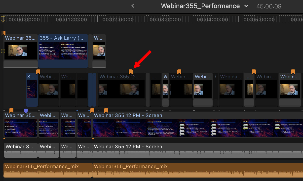 Here’s my edit. Unlike Premiere, all markers are attached to clips, not the timeline (red arrow above). Orange indicates a chapter marker.