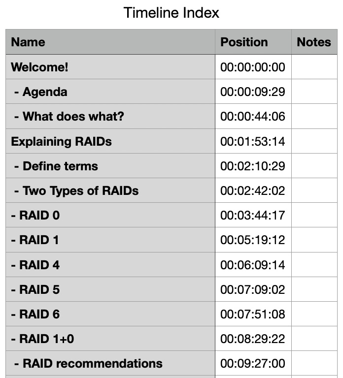 The Timeline Index is now filtered so only chapter markers are displayed. Once the display is set, I also verify that markers are spelled correctly and formatted the way I want. (A double-check never hurts.)