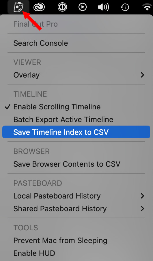 With Final Cut Pro selected and the Timeline Index open and filtered, click the CommandPost icon in the menu bar. (This is a portion of the Final Cut menu.)
