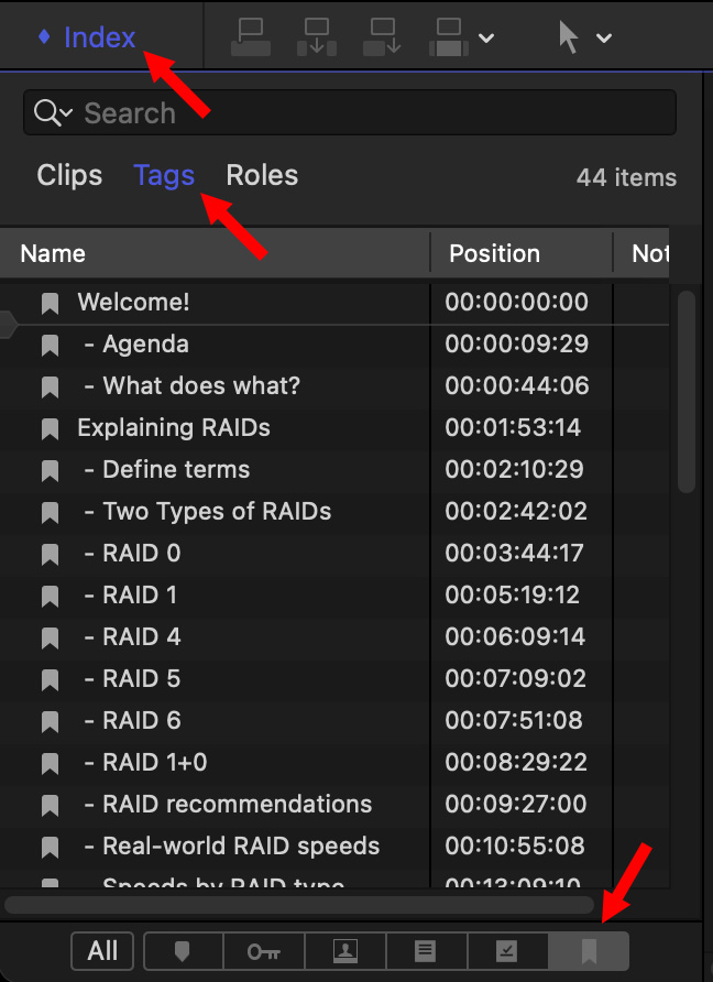 All markers – clip, to-do or chapter – are displayed in the Timeline Index. To see them: