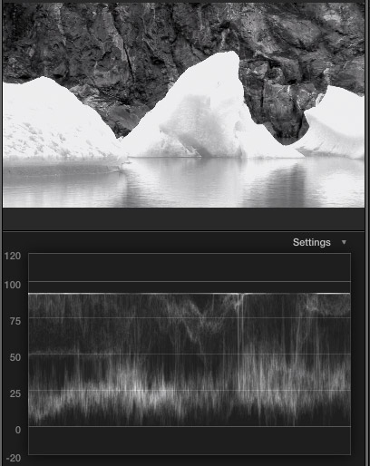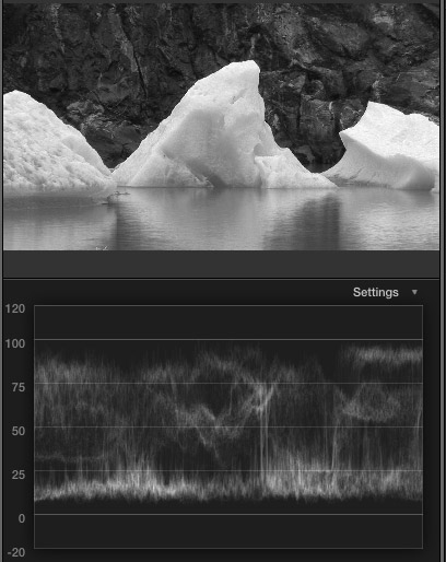 Here’s an image with the Black and White effect applied to it. Notice that all the texture and detail in the icebergs is still visible. The white levels, as displayed in the Waveform Monitor below the clip. show a good range of detail with no clipping.