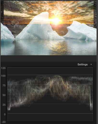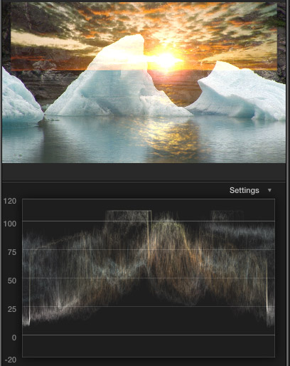 Now, compare that same image when the 50’s TV effect is applied. Notice that all the detail in the iceberg texture is gone. The highlights are all smooshed together. (“Smooshed” is a technical term that means squeezed beyond all recognition.) Look at the white level clipping at the top of the waveform monitor. Those thin white lines represent image pixels that all have the same white level and lost texture.