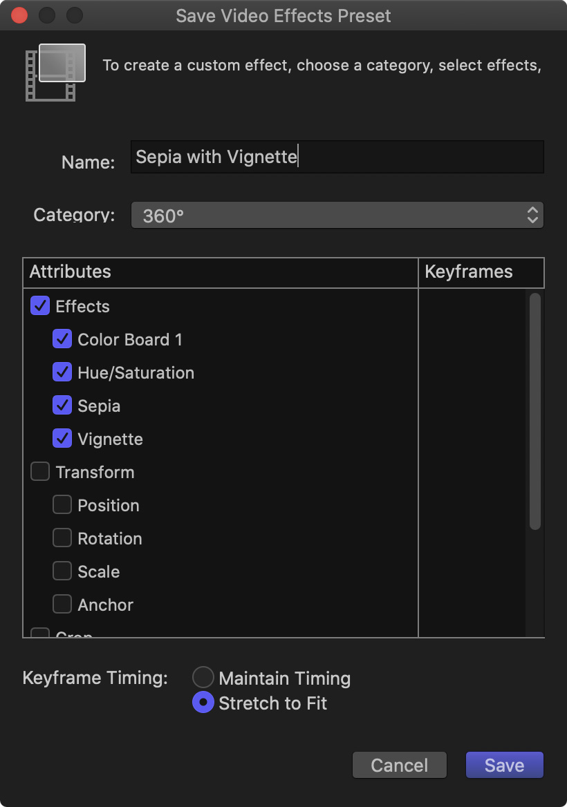 NOTE: By default, Final Cut selects all the effects with settings that have been modified. To exclude an effect from a preset, uncheck it.