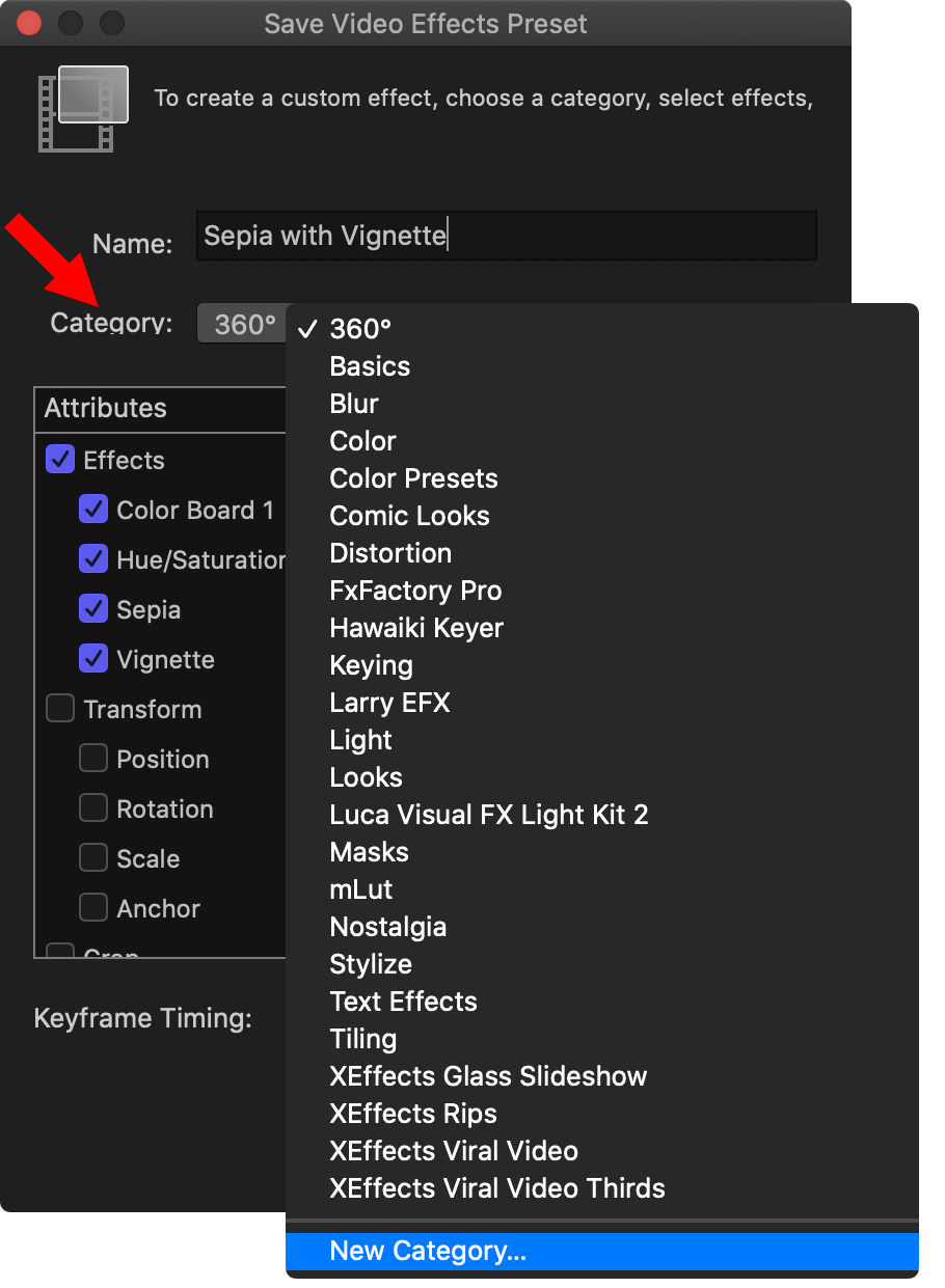 Click the Category menu to display the current categories in the effects folder. You can either store your newly-created effect in one of the existing categories…