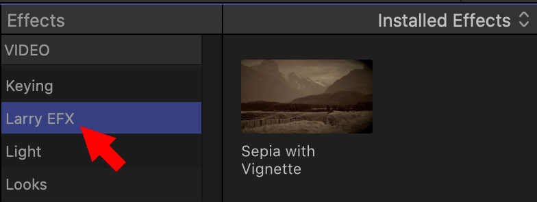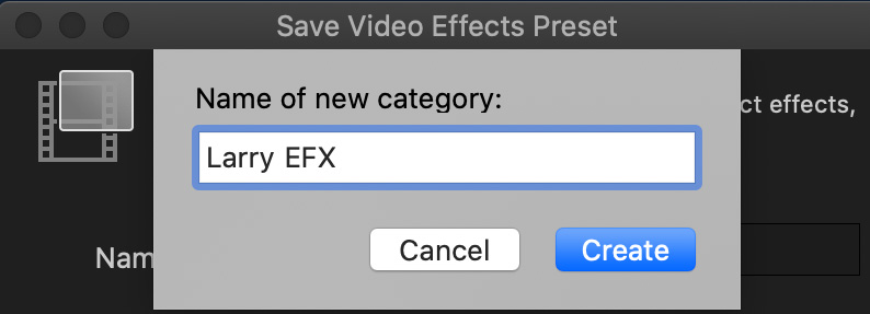 Or select New Category at the bottom of the popup menu to display a dialog to create and name a new effects folder. Here, I created a new folder called “Larry EFX”.