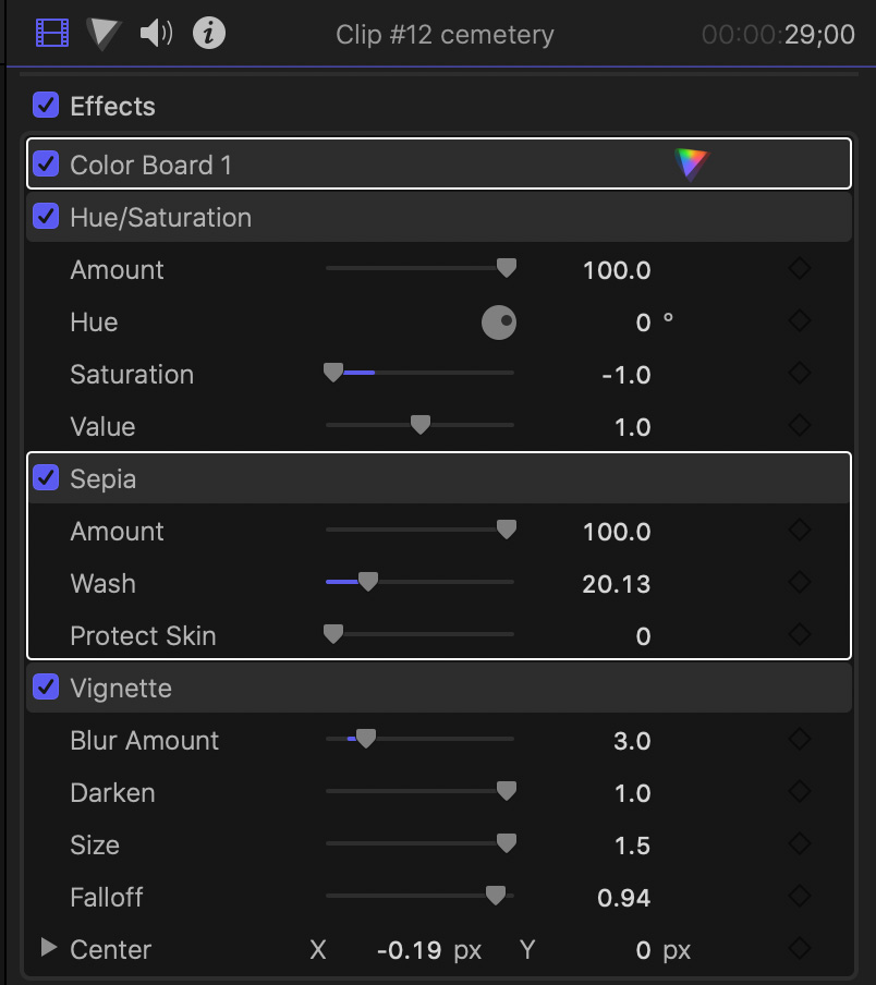 A look into the Inspector shows this clip has the following effects applied: