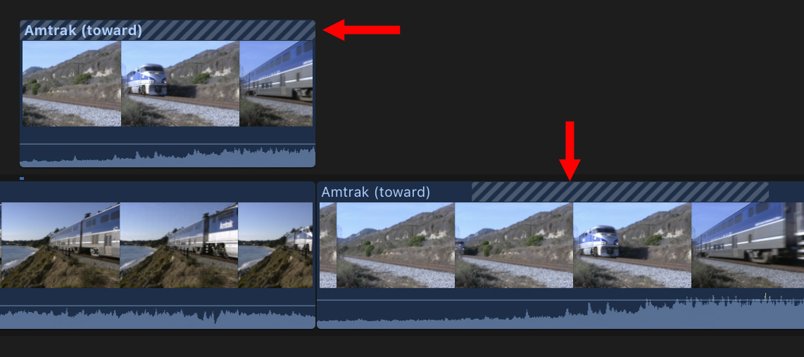 “Can you tell me what the diagonal stripes on audio clips mean in the current version of FCPX. They are a bloody nuisance and I would like to get rid of them.”