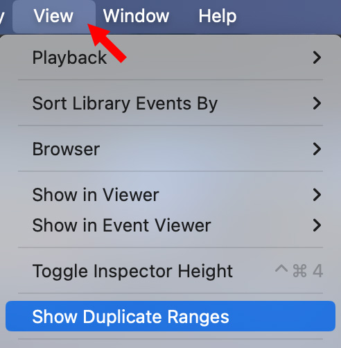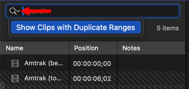 Click the small chevron in the search box (red arrow) to only display clips with duplicated media in the Timeline Index.