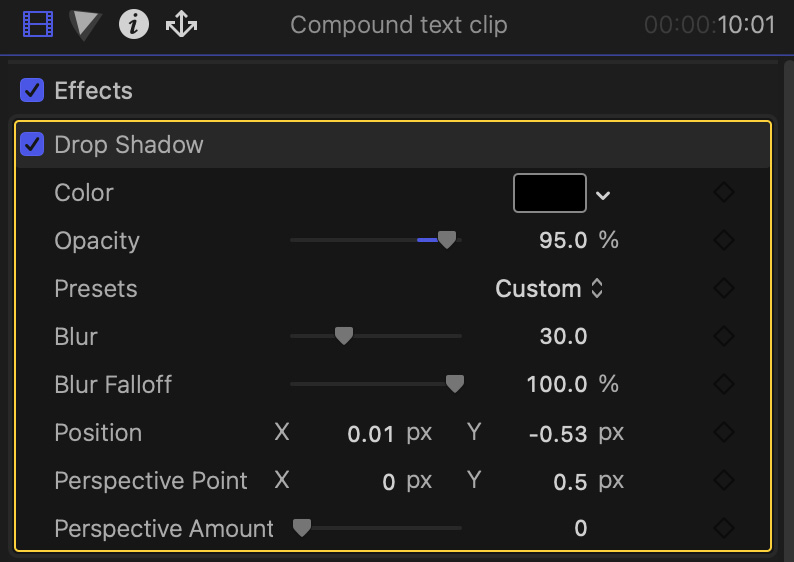 Finally, drag Effect browser > Stylize > Drop Shadow on top of the compound clip. Adjust the settings in the Video Inspector until they look the way you want. The screen shot above shows the settings I used.