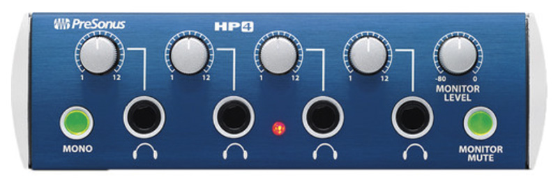 The iRig only has one audio output. But I needed audio sent to at least four, and potentially five, destinations. So, I bought a PreSonus HP4 – a four-channel headphone distribution amplifier. Each output has its own volume control, which allowed me to customize the volume for each guest.