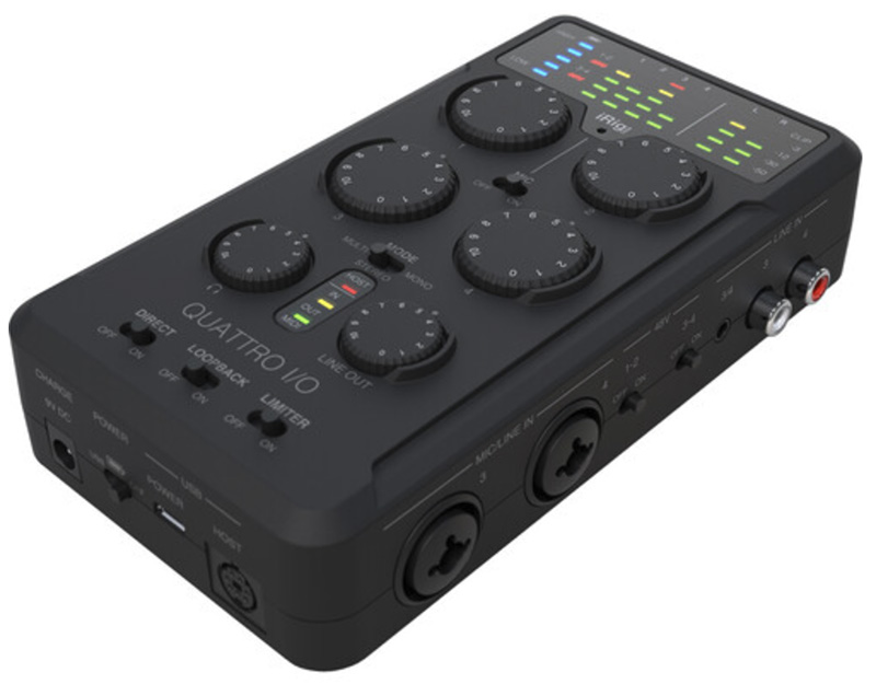 I used an iRig Pro Quattro I/O for mixing the two mics. This little device was surprisingly flexible. It can mix up to four mics, supports multi-channel output via USB, supports phantom power via battery or USB power, has individual channel audio meters as well as main mix levels, and is the size of a thick iPhone.