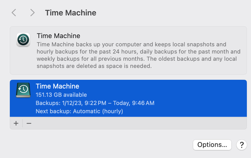 Click the Options menu to specify any external drives that you want to exclude from backups. Here, I’m excluding two attached SSD drives.