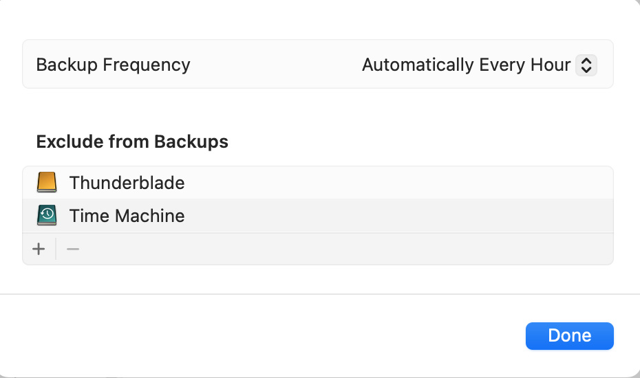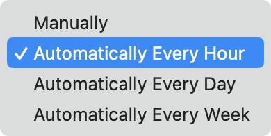Click this menu at the top of the Exclude panel to specify how often to save backups. The default is every hour. This is a good choice for your computer, where files change rapidly. However, daily or weekly backups save storage space for drives with limited space, or data that doesn’t change very often.