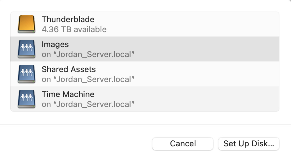 While you can use a local server volume for this, I found it faster and easier to just attach a Samsung T7 – or T9 – SSD, tuck it behind my computer and, essentially, forget it. Time Machine handles all backups and, if I delete a file, Time Machine makes recovery very easy. This has worked great for several years.
