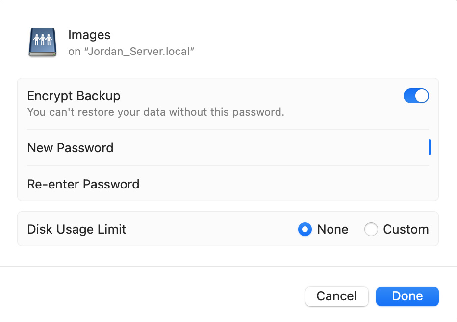 This panel provides options for encryption, password protection and whether to limit the amount of disk space that Time Machine uses.