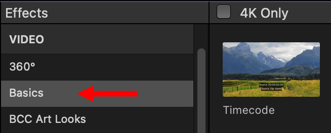In the timeline, open the Effects Browser and apply Basics > Timecode to the clips you want to display timecode.