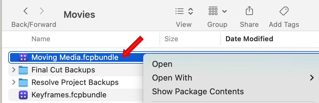 A Final Cut Library is actually a “super-folder,” called a “bundle.” This is a folder that acts like a single file. Normally, when you click it, Final Cut starts.
