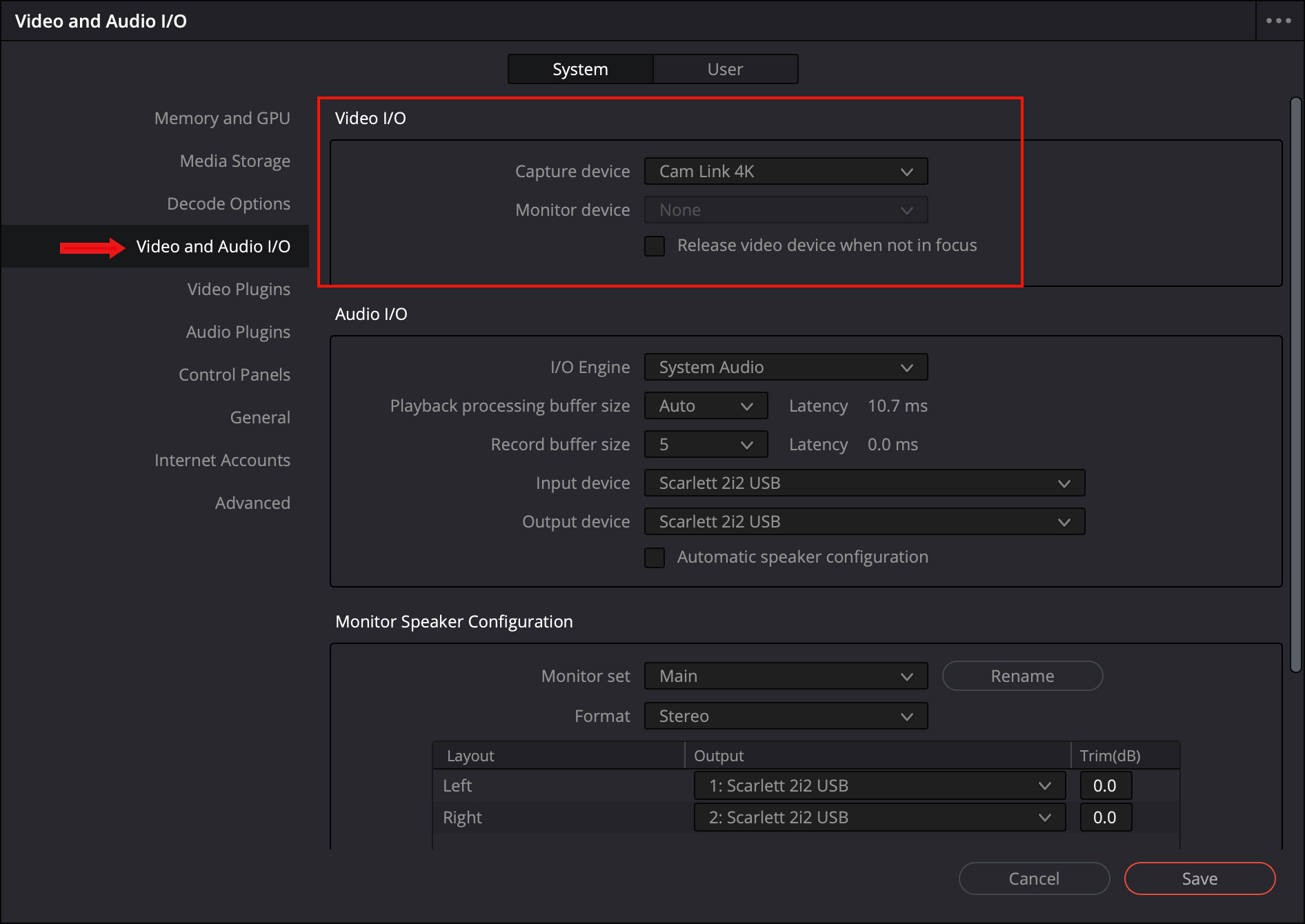 A third monitor, generally a color reference monitor, also requires setup; this time from DaVinci Resolve > Settings > System > Video and Audio I/O. For specific monitor settings, please refer to the Resolve User Guide.