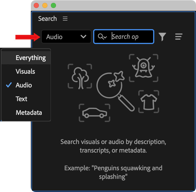 This opens the new search panel. Here, you can search on “Everything” – visuals, audio, text, or metadata – or restrict the search to a specific element.